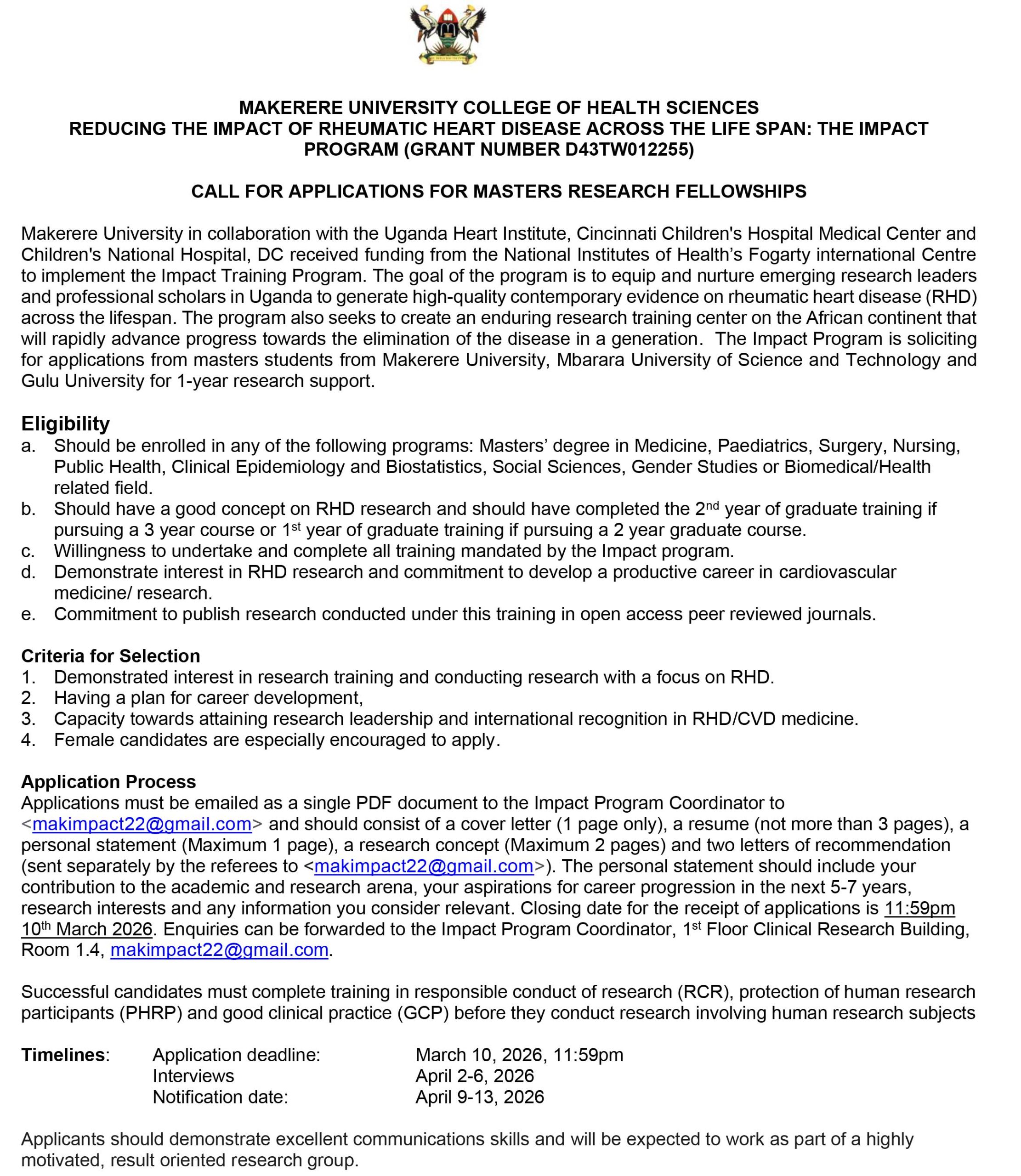 Makerere University in collaboration with the Uganda Heart Institute, Cincinnati Children's Hospital Medical Center and Children's National Hospital, DC received funding from the National Institutes of Health’s Fogarty international Centre to implement the Impact Training Program